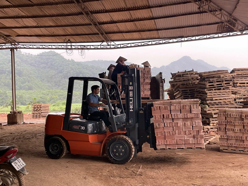 Gạch: xe nâng 3 - 3,5 tấn, khung nâng cơ bản hoặc chui container từ 3-5 mét, lốp hơi hoặc đặc, bộ công tác dịch giá, gật gù, kẹp gạch